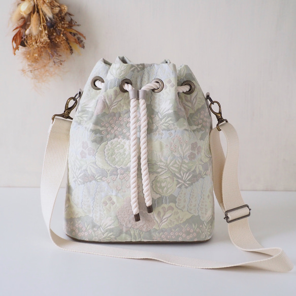 淡いグリーン系の少し光沢のあるジャガード生地でつくった巾着ショルダーバッグ。