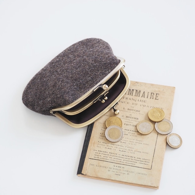 -     ■ツイードの親子がま口財布 / チャコールグレー■ plum(tw-cgy) ¥5,900 丸い形がかわいい親子タイプのがまぐち財布です。 peana.の二つ折りサイズの親子がま口財布は2サイズありますが大きいサイズの方です。 パカっと開けると中にもうひとつがま口がある親子になっていて カード、小銭、お札を分けて入れられるので便利です。 お札は二つ折りで入る大きさです。 黒のたて糸とグレーやブラウンのミックスの横糸で平織のツイード生地で 全体的にはチャコールグレーやダークブラウンのような色味です。 ミックスカラーの糸で織られているので深みのある色合いが生地の魅力を増しています。 生地の雰囲気は暖かみのあるマニッシュな印象になっています。 内布はダークブラウンです。 他の色柄に変更もできますのでご相談ください。 子がまの内側は小銭で汚れやすいので 汚れの目立ちにくい色のキャンバス生地を使用しています。 口金の色はアンティークゴールドです。 内ポケット(カードが6枚程度入る大きさ)はオプションで追加できます。 ひとつ300円です。両側に付ける場合は【内ポケット×2】を選択してください。 SIZE たて12.5cm(ひねり部分含まず) よこ16cm 口金の幅 (外)13cm (内)11cm 表地 ツイード 裏地 綿100% 表地の裏にキャンバス生地を貼り合わせて仕立てているので しっかりした丈夫な作りになっています。 お好みの生地に変更するセミオーダーもお受けできますのでお問い合わせください。 ■ご注文前にご一読ください■ https://peana.base.shop/items/81375482 ■ラッピングについて■ https://peana.base.shop/items/81375902 ■セミオーダーについて■ https://peana.base.shop/items/81376152