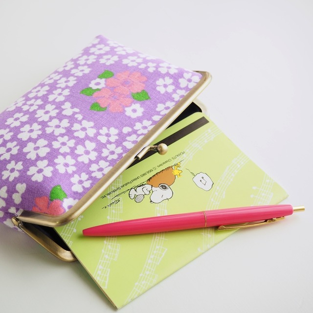 スクエア型のがま口の通帳ケースです。 リバティタナローンのアーカイブライラックでつくりました。 通帳が8冊程度入ります。 ペンや印鑑などもまとめて入れて持ち歩けるので便利です。 化粧ポーチなどにも使えます。 内ポケットが2つあります。 片方は真中に仕切りがあり普通サイズのカードが縦に入れられます。 普通のキャッシュカードの厚みでひとつのポケットに6枚くらい入ります。 もう片方の内ポケットは真ん中の仕切りはありません。 大きめサイズのカードや領収書などを入れられます。 内ポケットの真ん中の仕切りは「両方仕切りなし」「両方仕切りあり」に変更も可能です。 (生地が残っている場合に限ります。) 口金の色はアンティークゴールドです。 内布はダークグレーの無地です。 ご希望の色柄に変更もできます。ご相談ください。 【アーカイブライラック】 リバティ・ファブリックスのアーカイブに保管されていた 小さな紙サンプルにあったデザインから描かれた柄です。 庭に咲く花々がお話したり、おしゃべりしながら 不思議の国への道を歩むアリスの旅からインスピレーションを得ています。 柄の出かたはひとつひとつ異なります。 画像とは違う柄の出かたのものが届くことがありますのでご了承ください。 生地がある場合は、ご希望の柄の取り方でお作りすることもできますので ご注文前にお問い合わせください。 ■size たて 11.5cm(ひねり部分含まず) 横 18cm 厚み 2.3cm 口金の幅 16.7cm ■素材 表地 綿100% リバティ・タナローン 裏地 綿100% タナローンは上質なシルクのつやと手触りを木綿で再現するために 英国リバティ社が独自に開発したローン素材です。 表地の裏にキャンバス生地を貼り合わせて仕立てているので しっかりした丈夫な作りになっています。 お好みの生地に変更するセミオーダーもお受けできますのでお問い合わせください。 ■ご注文前にご一読ください■ https://peana.base.shop/items/81375482 ■ラッピングについて■ https://peana.base.shop/items/81375902 ■セミオーダーについて■ https://peana.base.shop/items/81376152