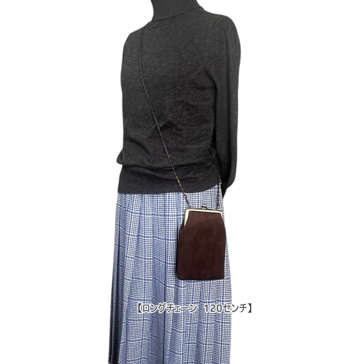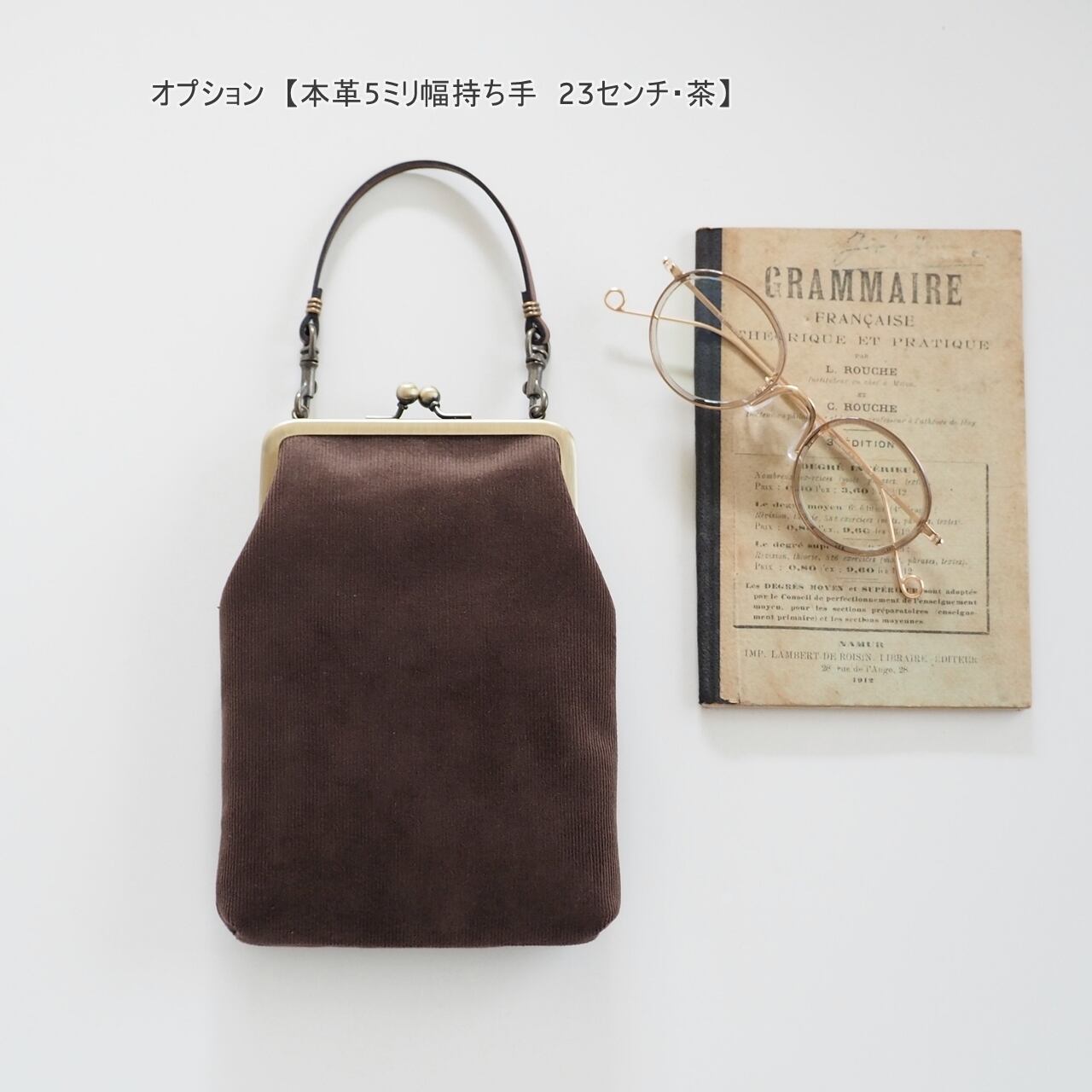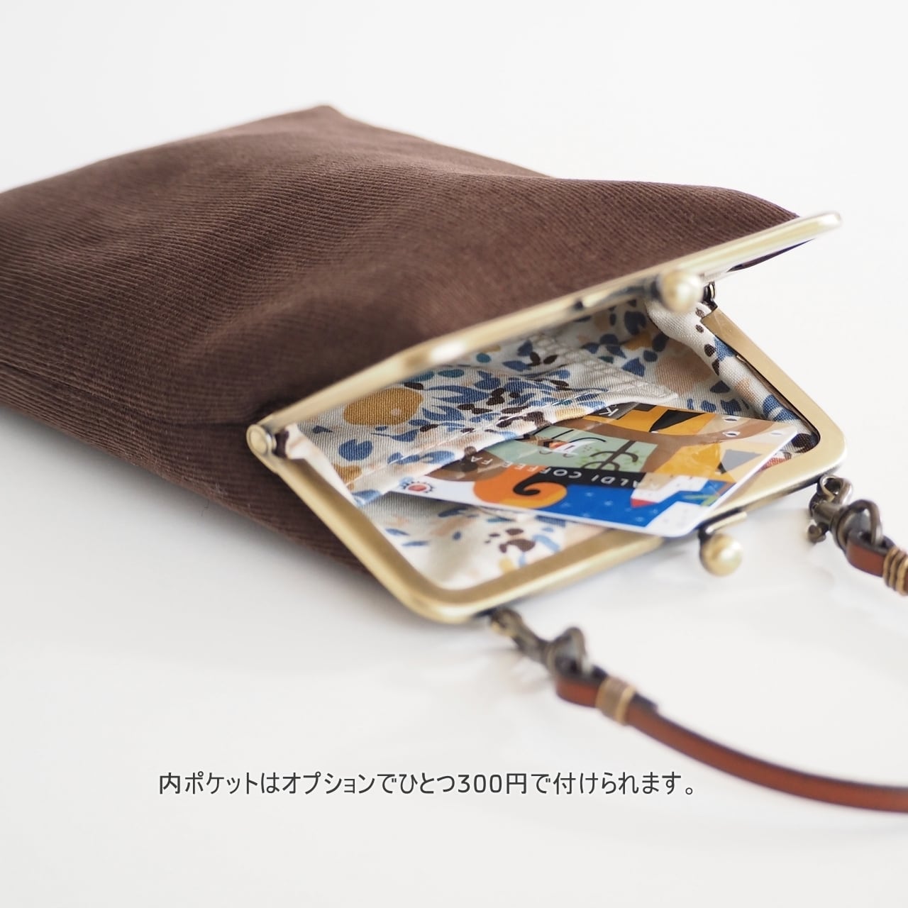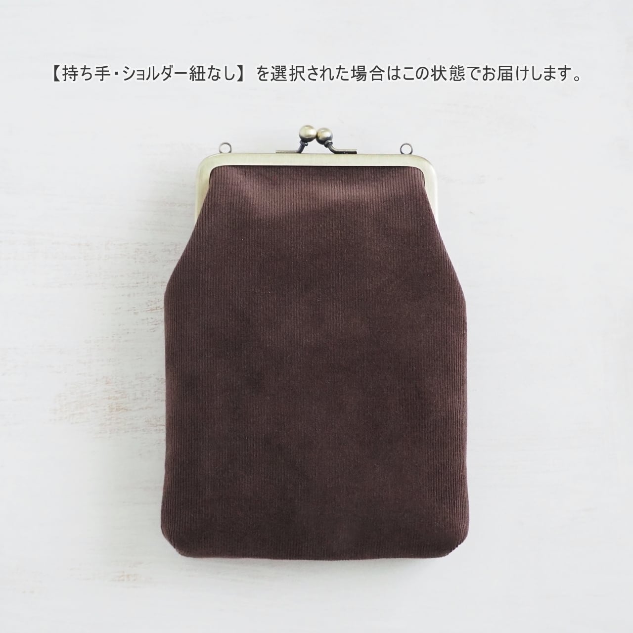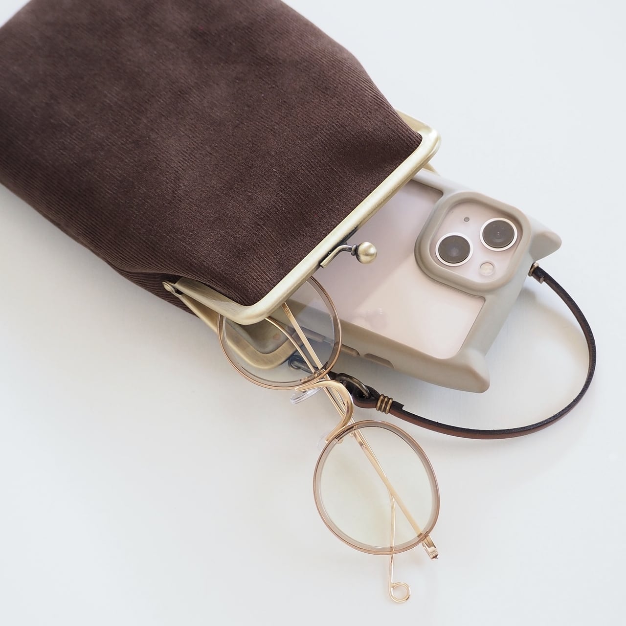 ダークブラウンのコーデュロイでつくったがま口のスマホポーチ・スマホポシェットです。