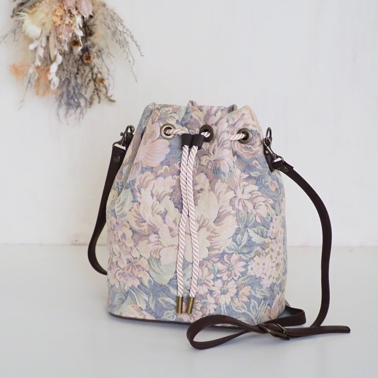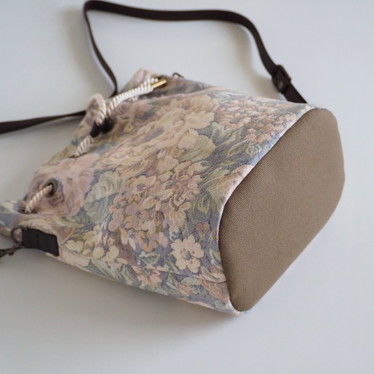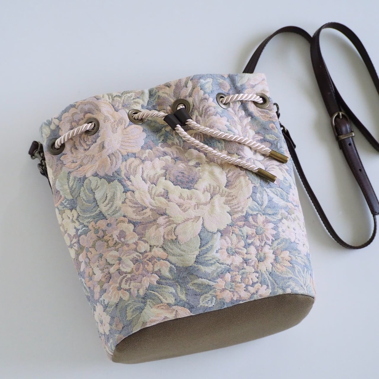 レトロクラシックなバラ柄のジャガード生地でつくった巾着ショルダーバッグ。