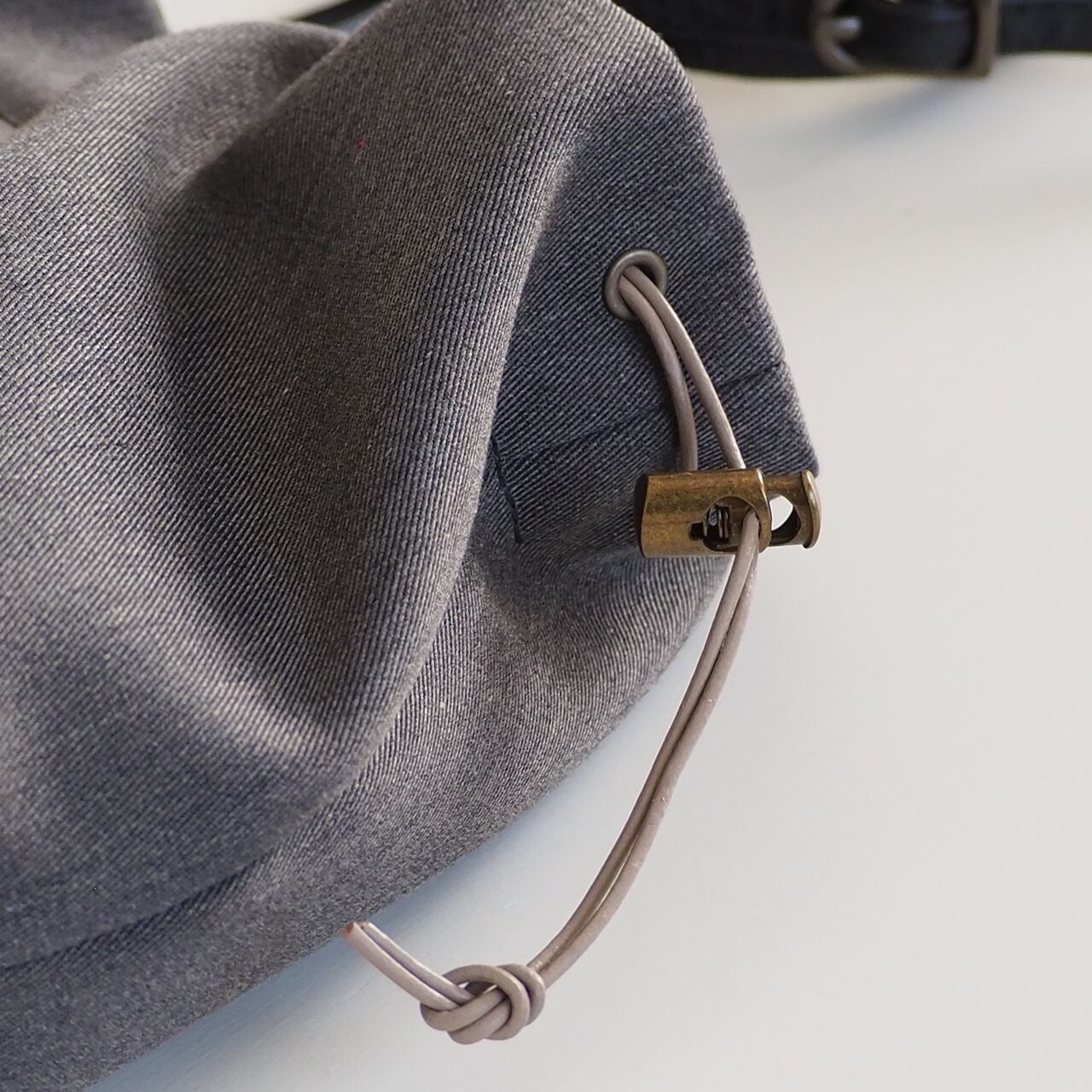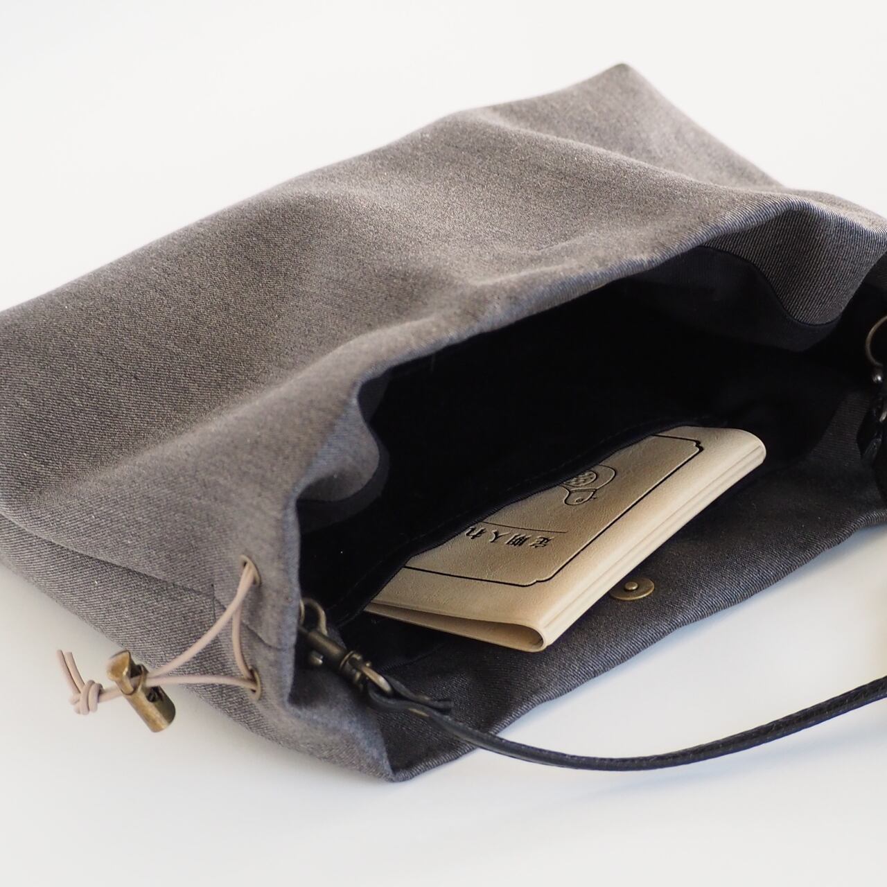 巾着を絞る紐は本革に蝋引きをした丸紐です。