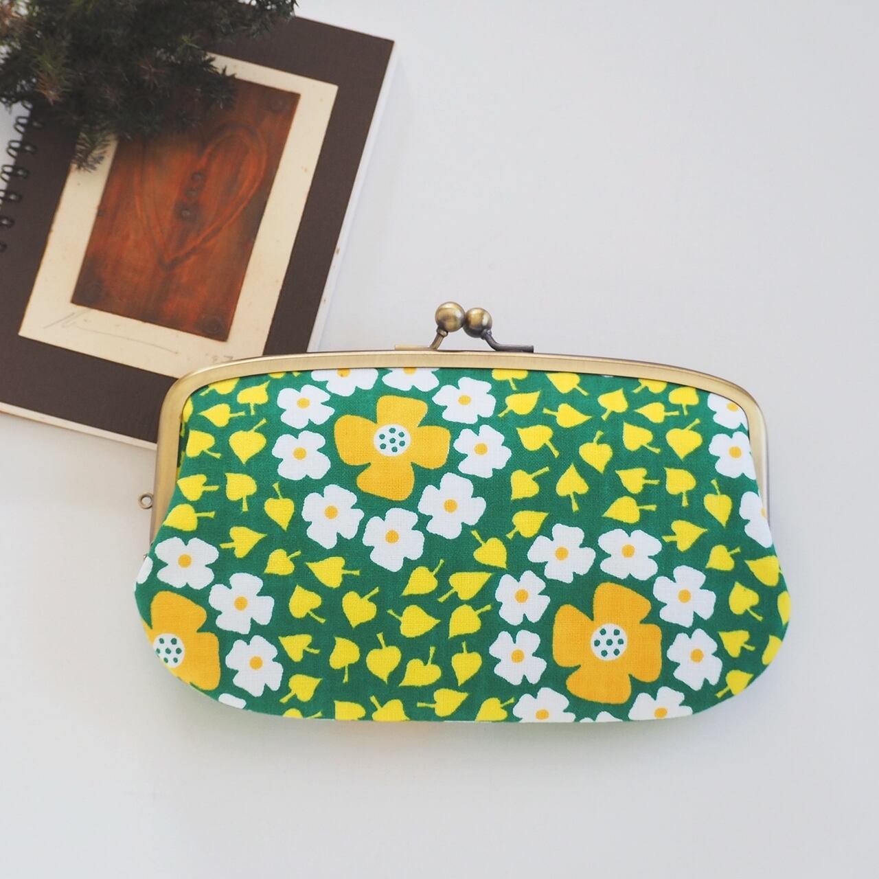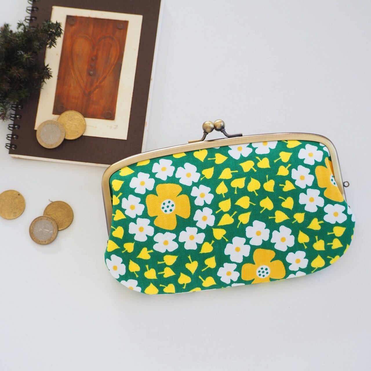 濃いめのグリーン地。大きな黄色の花を白い花がサークル状に囲んで