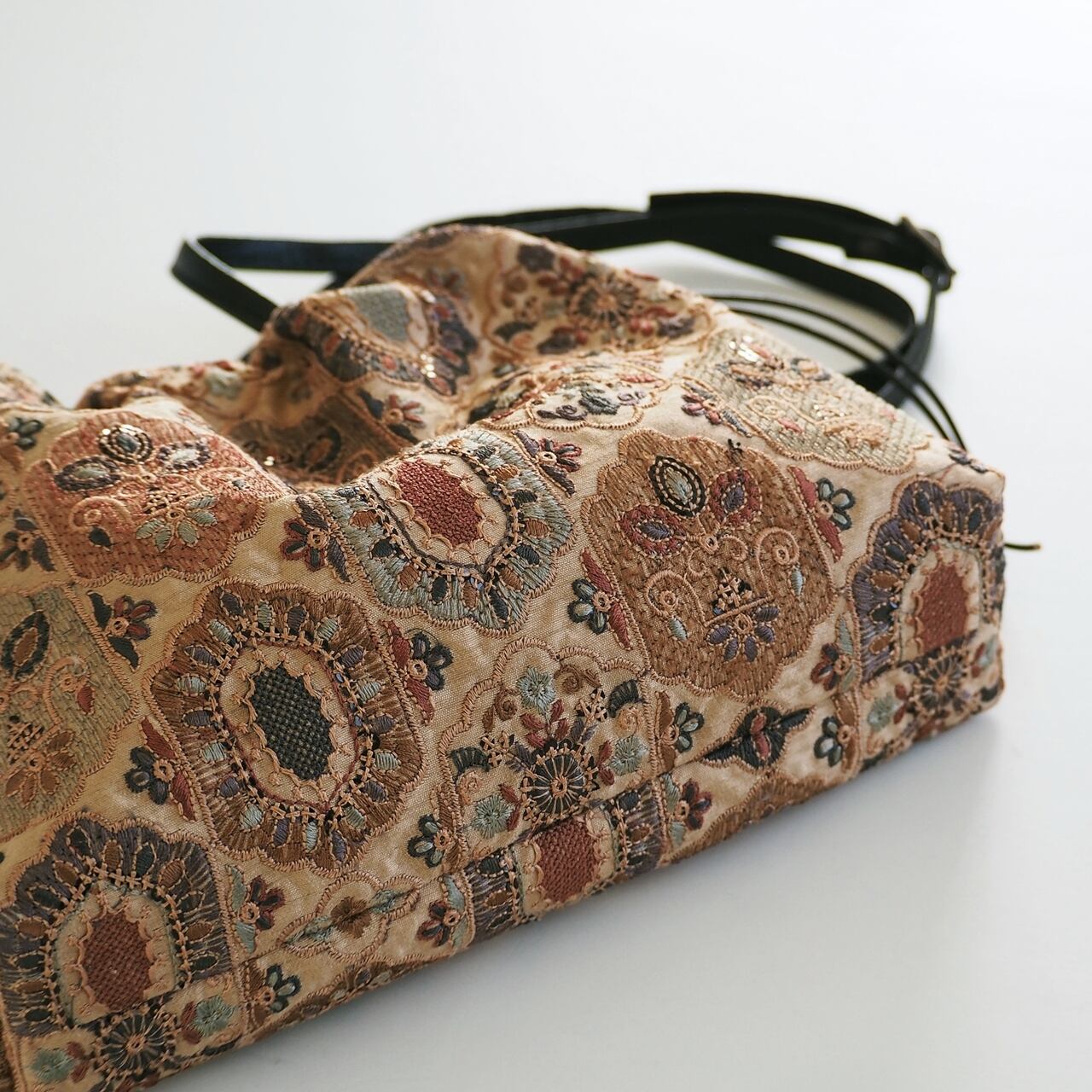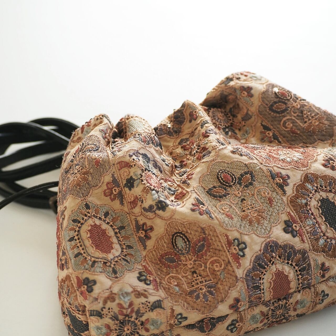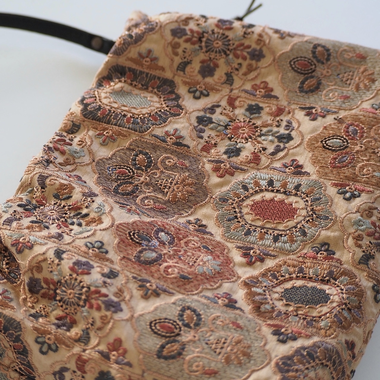 総柄ですが渋めの色合いの刺繍生地なので肌なじみもよくコーディネートに取り入れやすい雰囲気です。