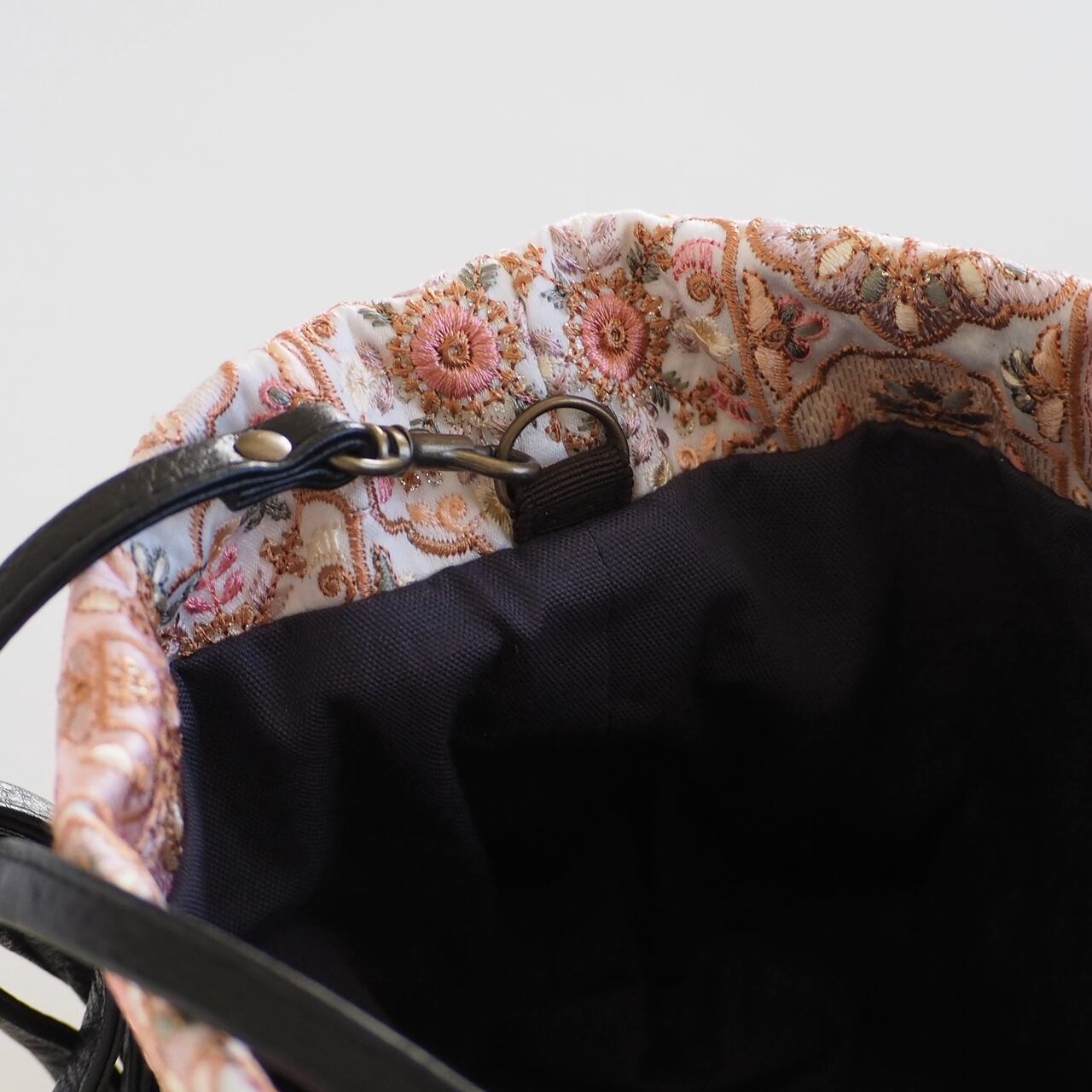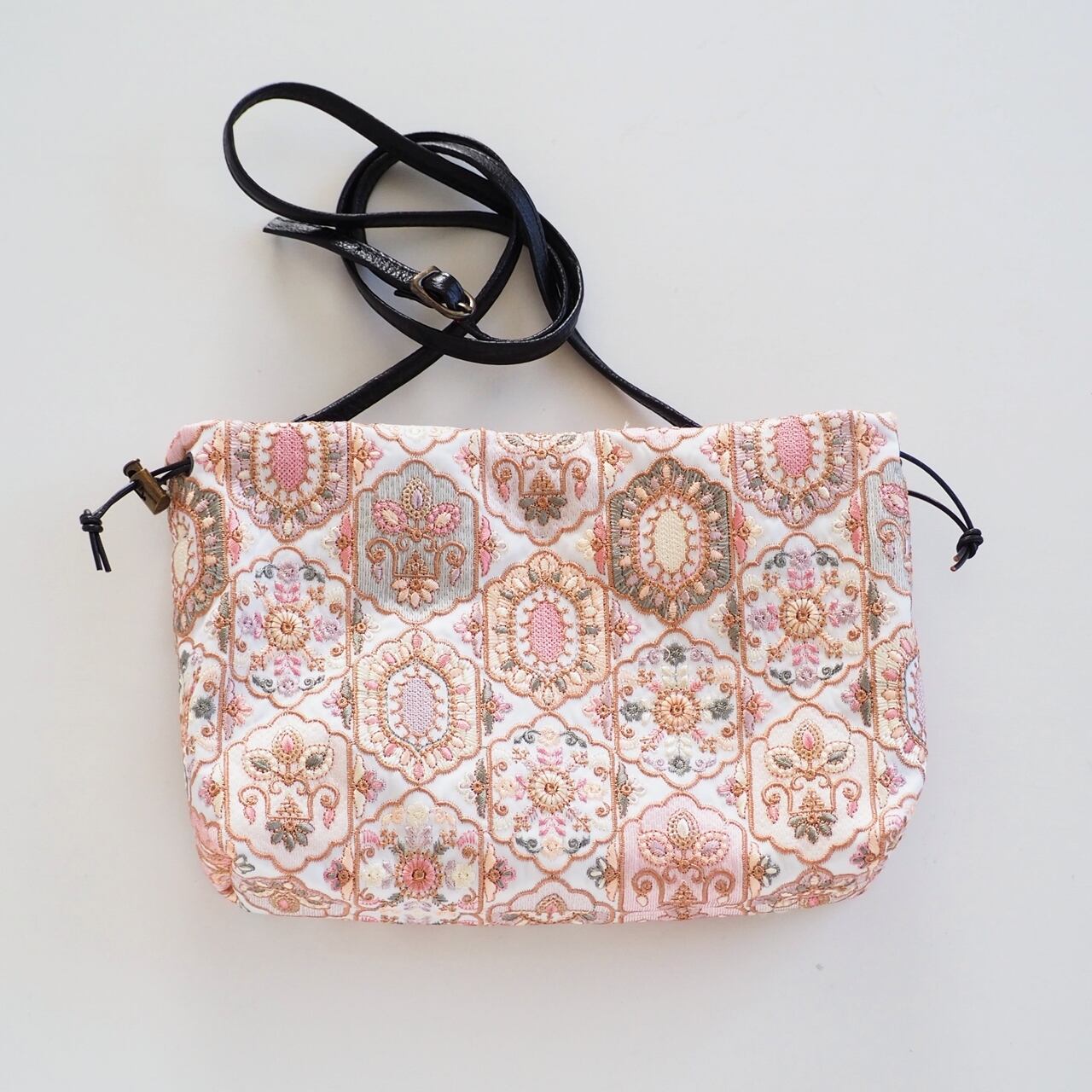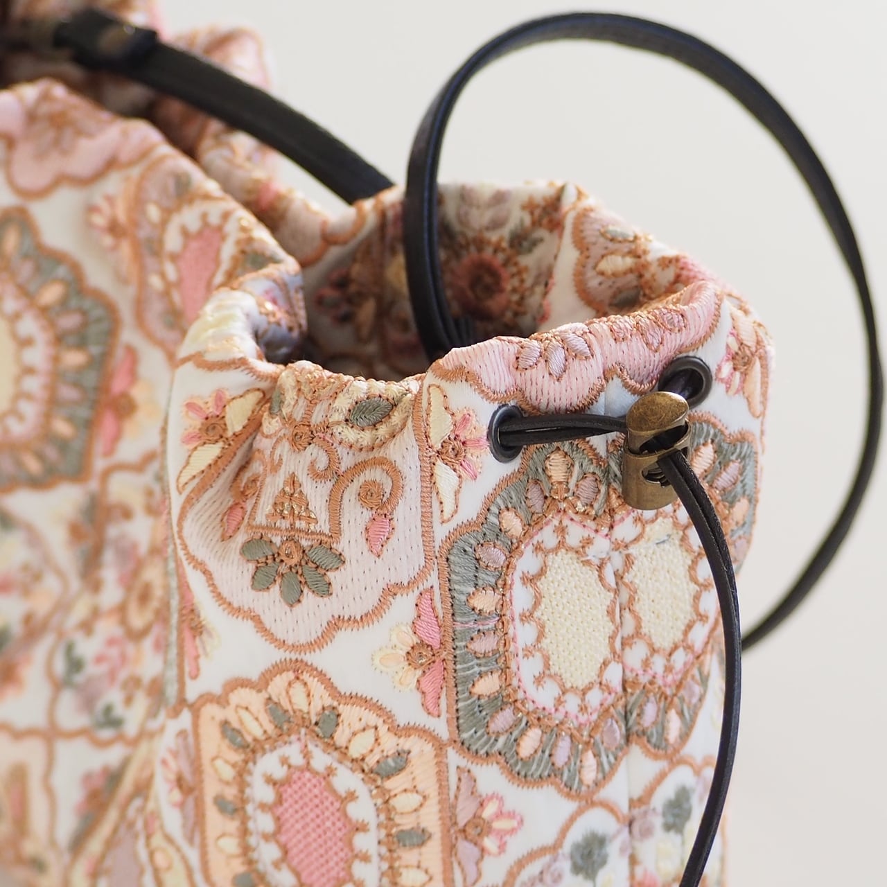 色とりどりの刺繍が施されていますが柔らかいくすみカラーなので肌なじみがよく洋服にも合わせやすい雰囲気です。