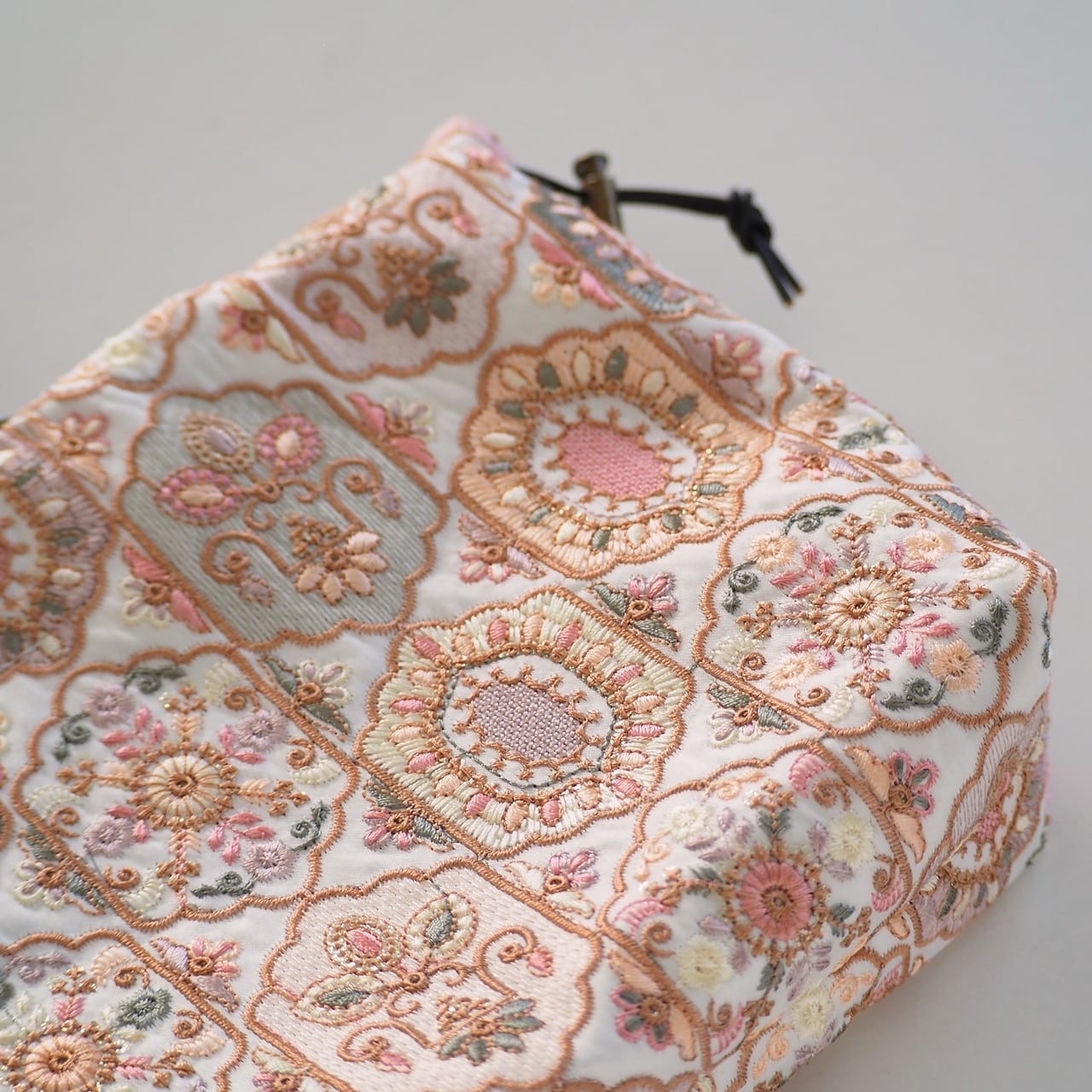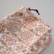 アイボリー地にゴールド、ブラウン、くすみカラーのグリーン、ピンクなどで刺繍されたとってもかわいい生地です。