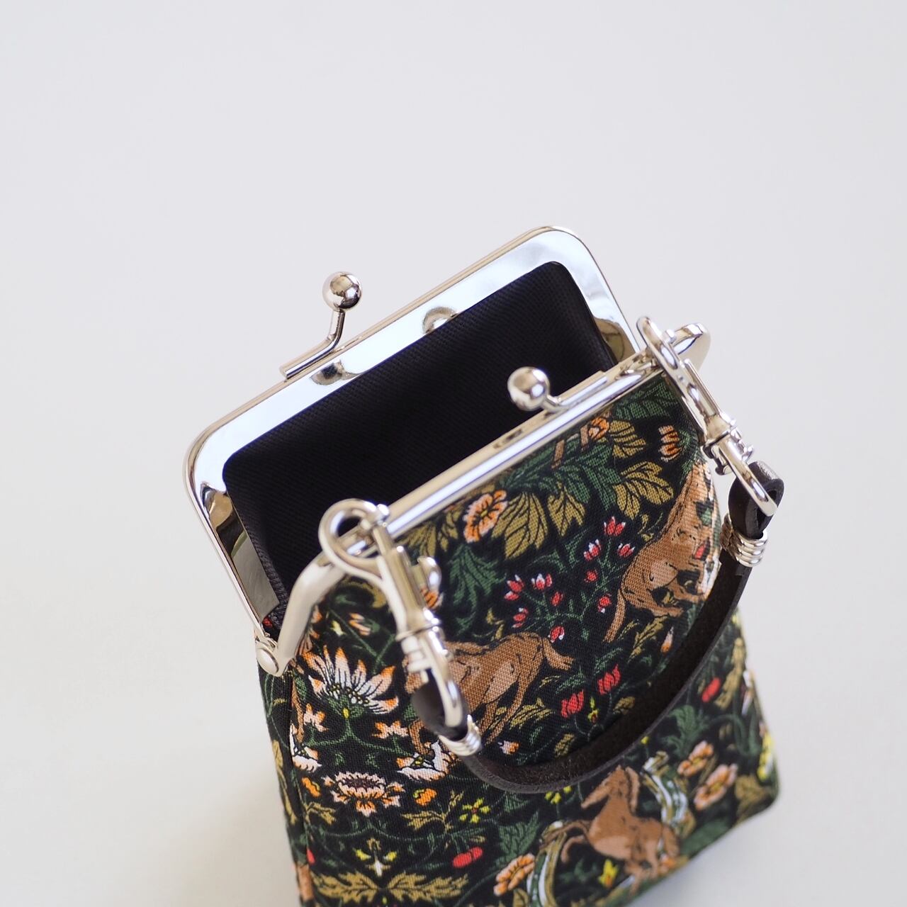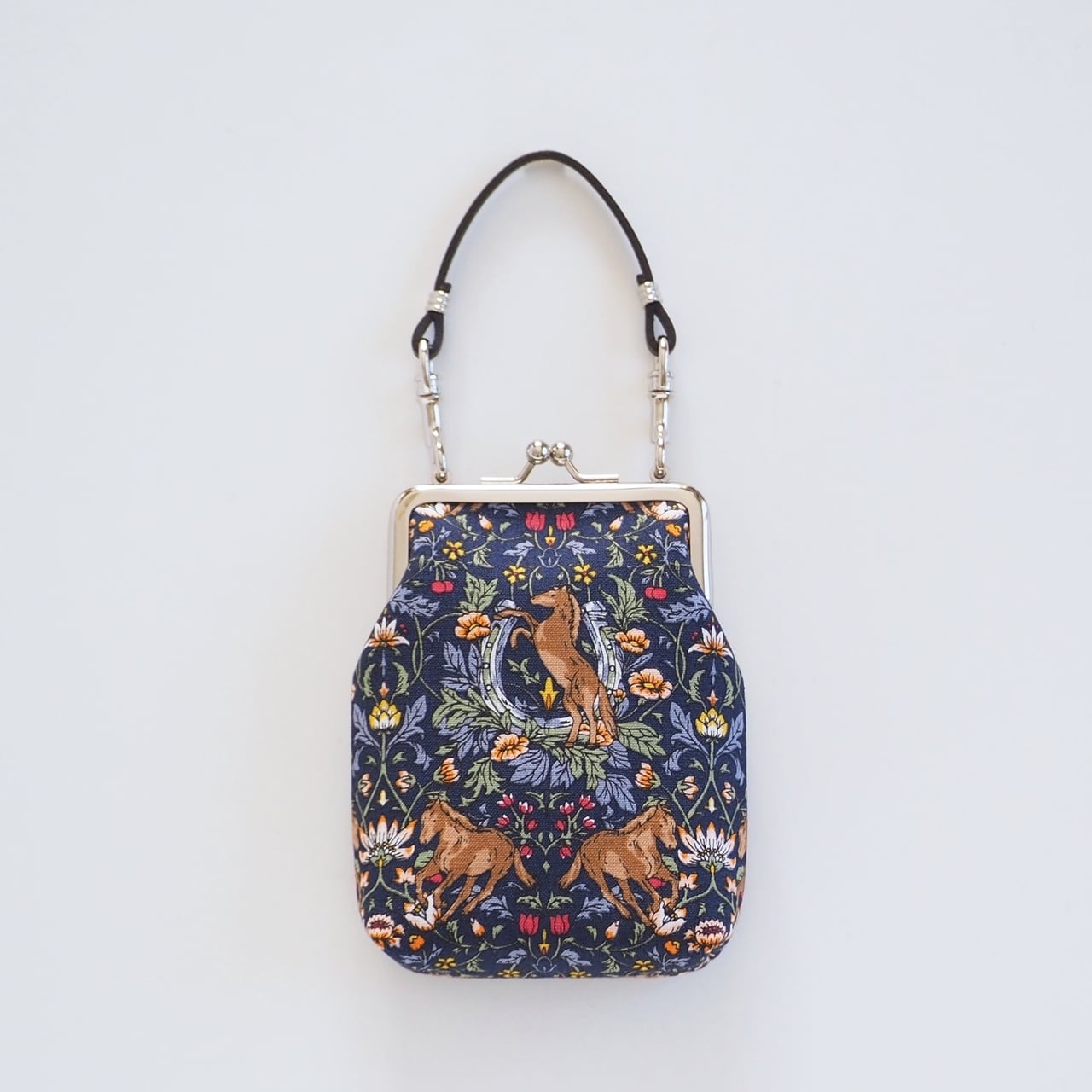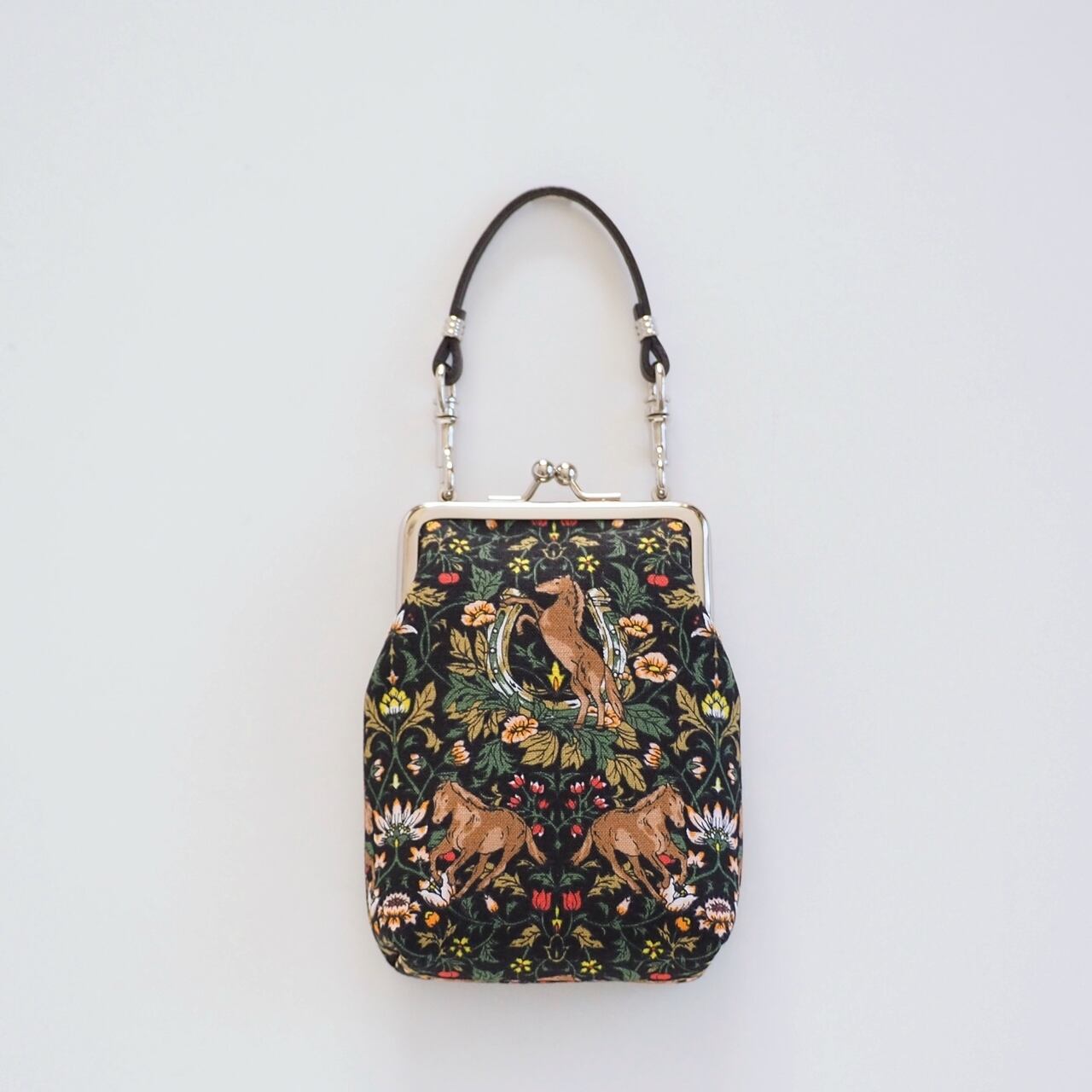 持ち手つきのがま口ポーチです。