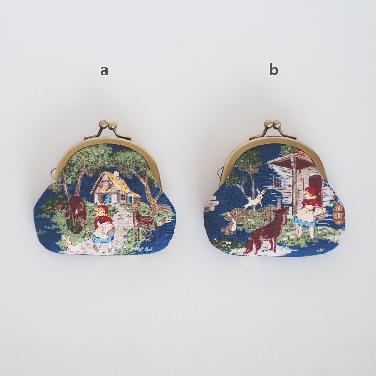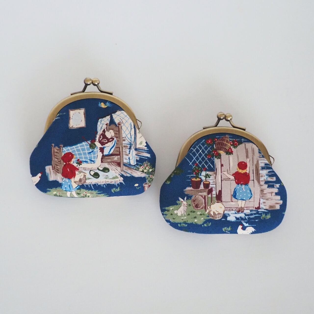 赤ずきんちゃんの物語の場面を切り抜いたような絵柄の生地でつくりました。